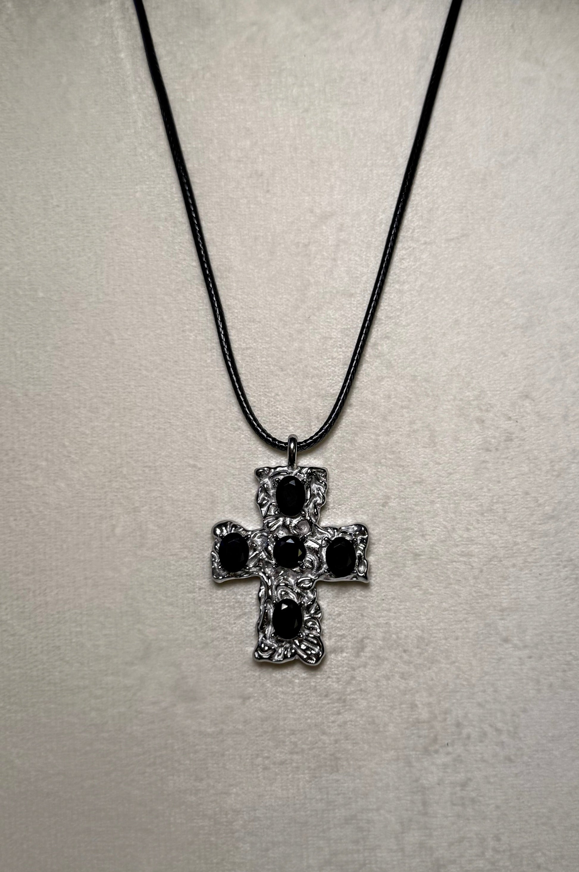 Stainless steel cross pendant, beautifully enhanced by natural black stones.
